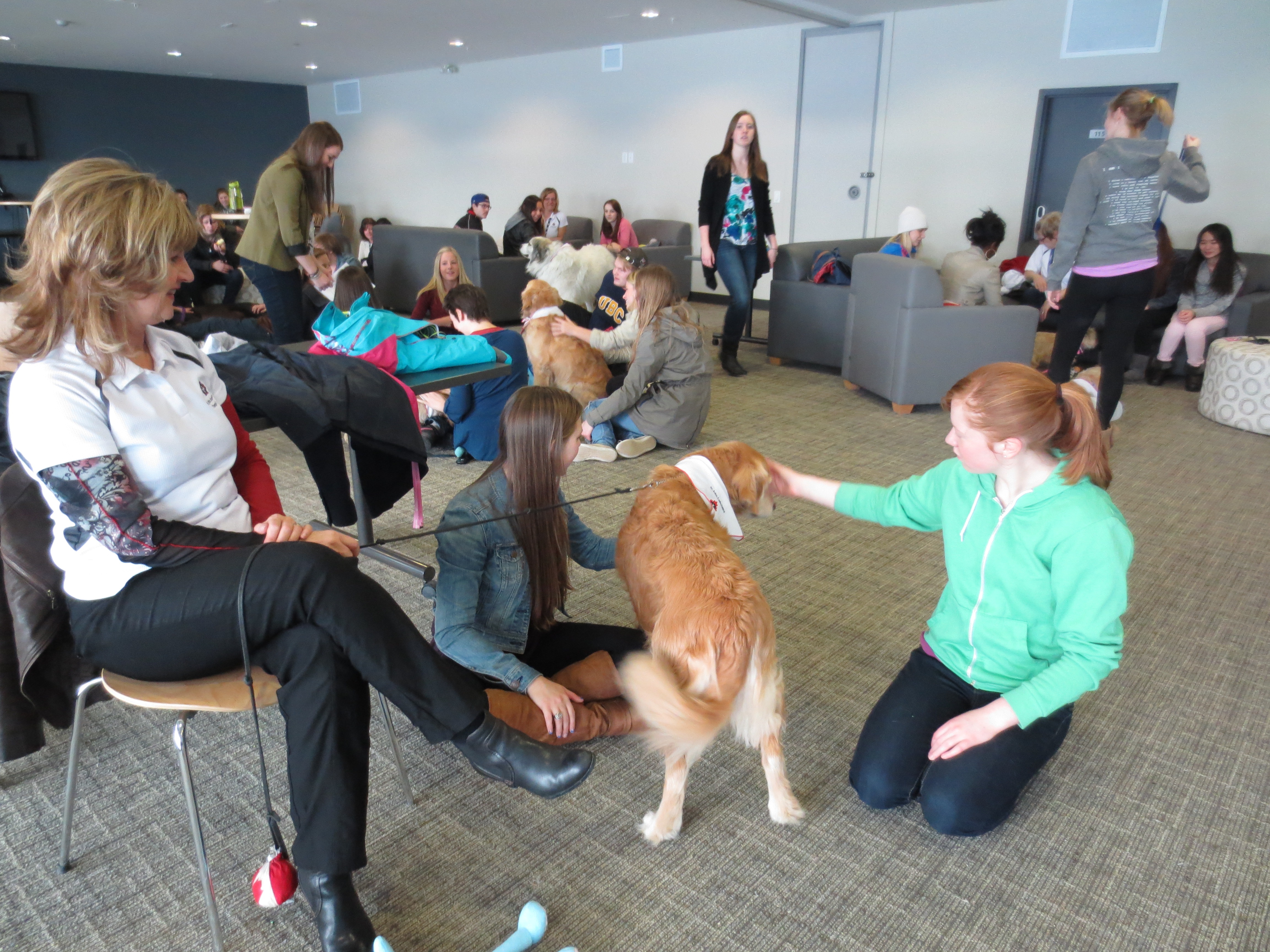 In December there was a invitation from St. John’s Ambulance for any Dog Handlers and their Therapy Dogs to join a six week study program at UBCO entitled: Promoting First Year Students Social-Emotional Well Being through Animal Assisted Therapy. The program is called B.A.R.K.= Building Academic Retention Through K9’s. This study program is organized by Dr. John Tyler Binfet, Assistant Professor at the Faculty of Education at UBCO. Dr. Binfet states they hope the results of this study will help university faculty better understand aspects of university students’ social and emotional development. Moreover, they are hopeful the findings will contribute to a better understanding of how to promote positive connections for students living in residence at universities through the use of Animal Assisted Therapy.
